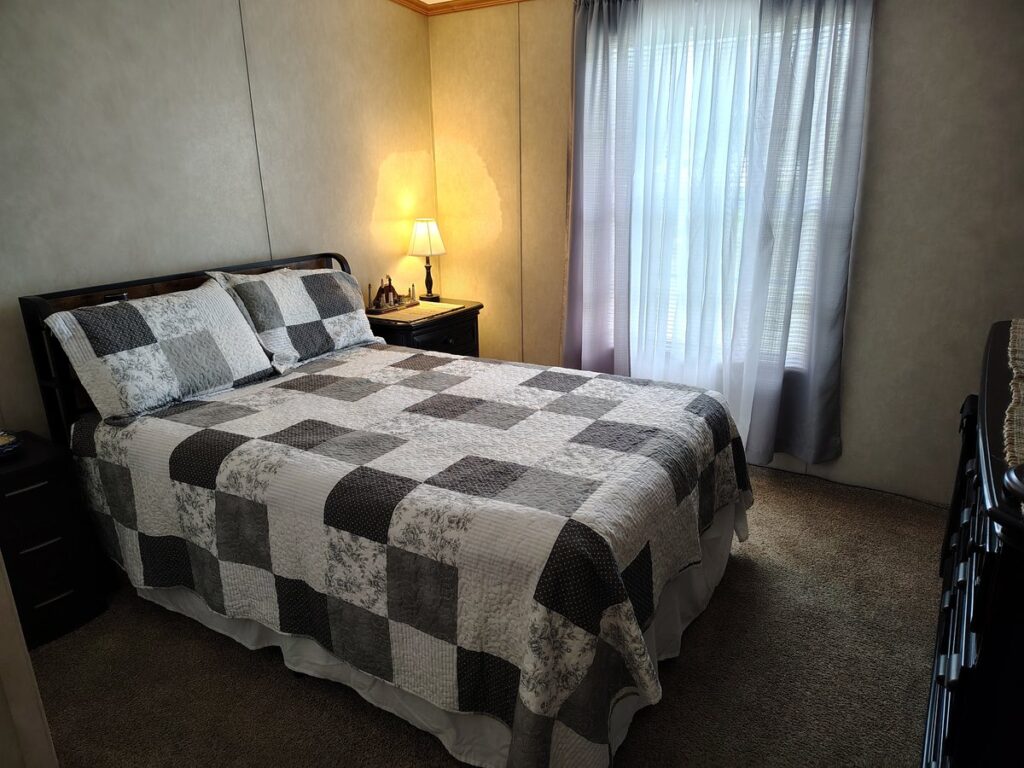 Move in ready home that has been well cared for. It is on an oversized lot with views of the woods from your patio/deck area. This home has a sprinkler system in the gardens and the lawn and shed for storage. Inside you will find neutral carpeting throughout the living room, dining room, and bedrooms. This is a Tamarack model so you have a spacious eat in kitchen with a TV on the wall that seller will leave for the new buyer. Kitchen has double kitchen sink, dishwasher, a huge pantry, and lots of cabinets. This is two bedrooms with two full baths. The master room has a shower stall. Make the call today as this is a home you like to see. Seller will provide a 1-year home warranty to ease your worries.