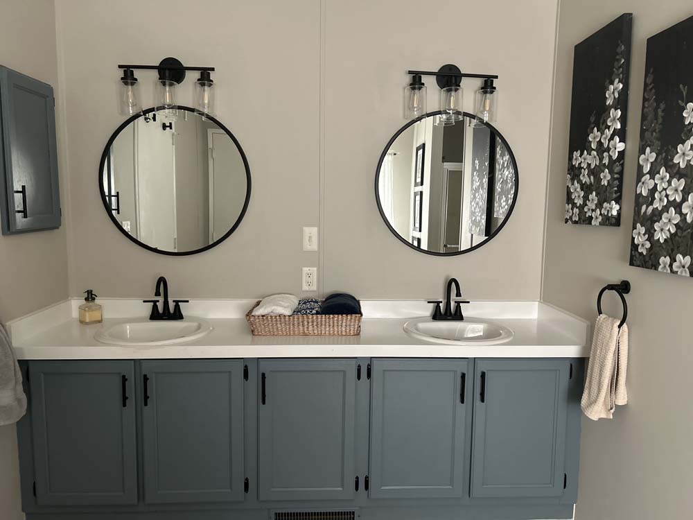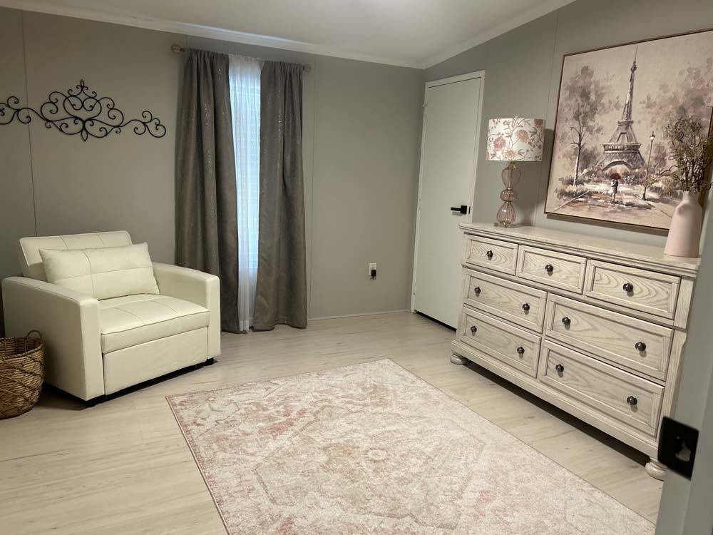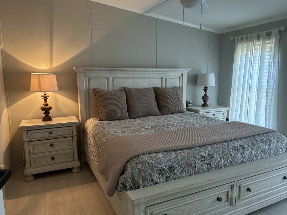 The home includes two bedrooms, each with a walk-in closet. The primary suite features a private bathroom with double sinks, providing both comfort and functionality. A second full bathroom adds convenience for guests or family members.